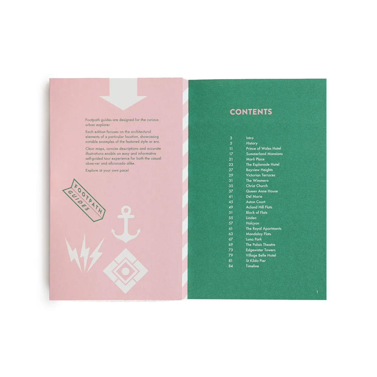 Footpath Guides: Melbourne St Kilda 1850-1960 provides an exploration of the eclectic style of the playful beachside suburb, ranging from Edwardian and Victorian mansions, Art Deco and Spanish Mission apartments, through to Mid-Century Modern flats.