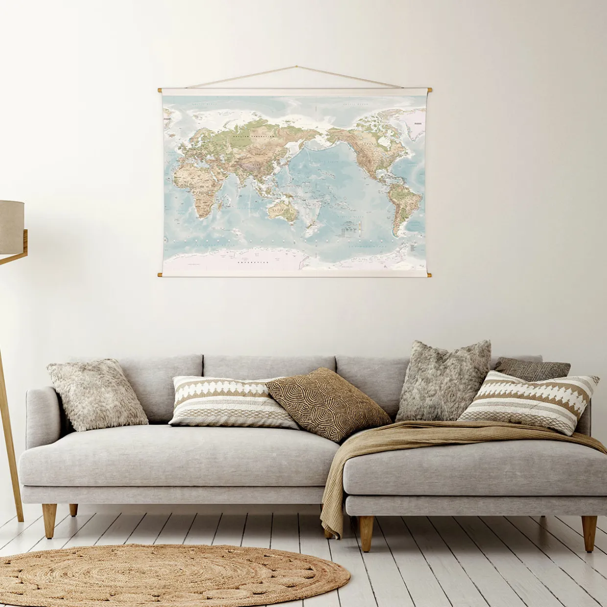 Features printed on cotton canvas using eco-friendly water-based latex inks; hand stitched to sustainably harvested bamboo rods; over 4000 features on the map including 2100 of the worlds major cities divided into population categories; over 2000 of the worlds major rivers, lakes, mountains, deserts, ocean, coastal and political features; shaded relief combined with earthy bands of colour depicting ranges of elevation Ocean Bathymetry Pacific Centred Miller Projection