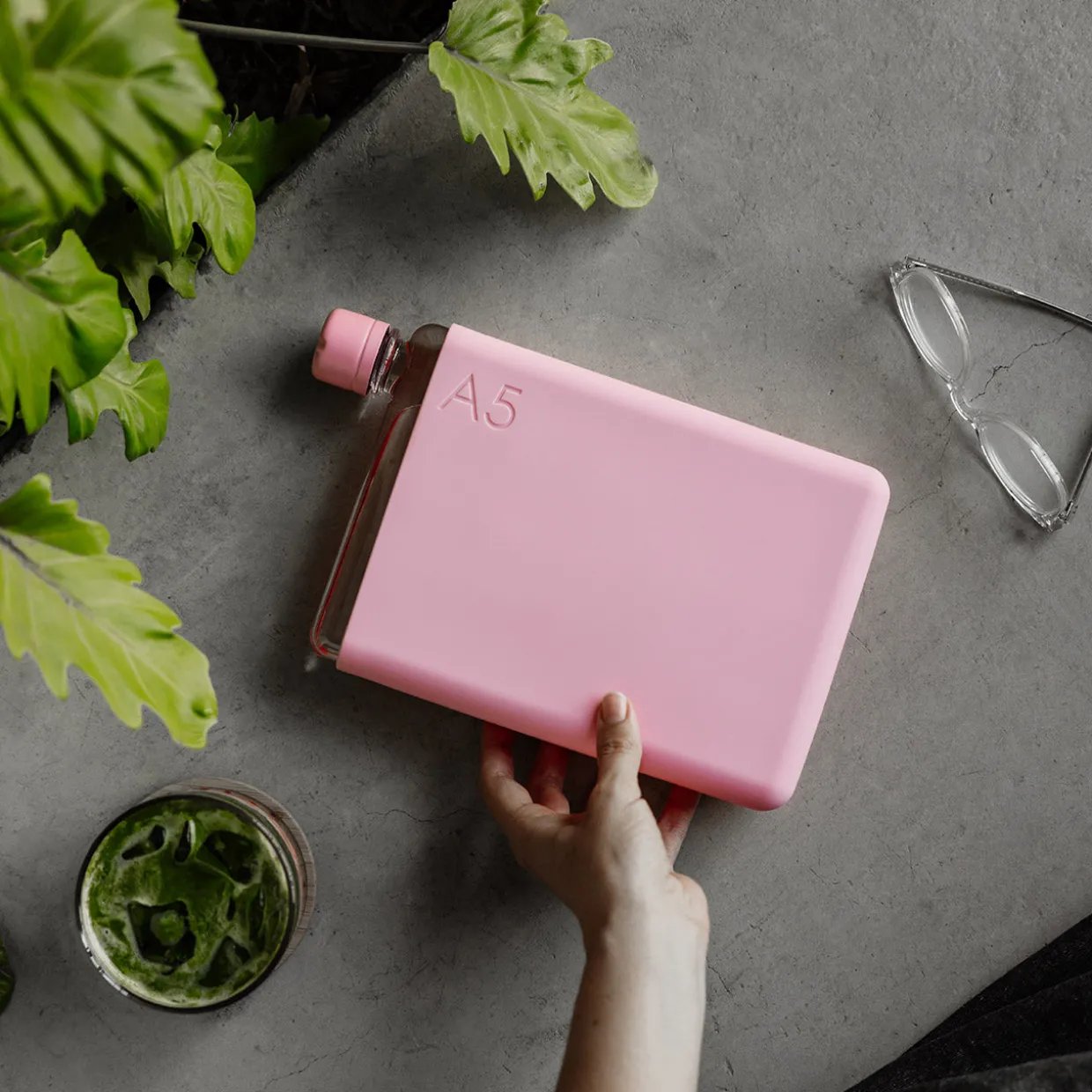 Slim and stylish, memobottle’s iconic A5 Drink Bottle is made even better with the colourful protection of the matching Cherry Blossom Sleeve.A mere 3cm thick, the A5 Drink Bottle slides neatly into your bag alongside notebooks, tablets and laptops to hold a massive amount of water without taking up a massive amount of room. Unlike traditional round drink bottles, which sit awkwardly no matter what else you’re carrying, the flat design of memobottle drink bottles allows for a Tetris-style fit that helps optimise your bag while helping keep you hydrated. Paired with its minimal yet sophisticated styling, it’s no surprise that memobottle keep winning design awards.Sleek and durable, the Silicone Bottle Sleeve gives your water bottle an extra touch of sophistication as well as an additional layer of protection from the elements. The matte silicone will keep the little bumps and scrapes of everyday life from affecting your memobottle, while also adding a touch of thermal insulation to keep your drink at its ideal temperature for longer.This bundle also includes a colour-matched stainless lid.