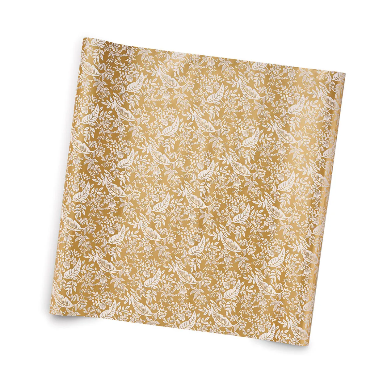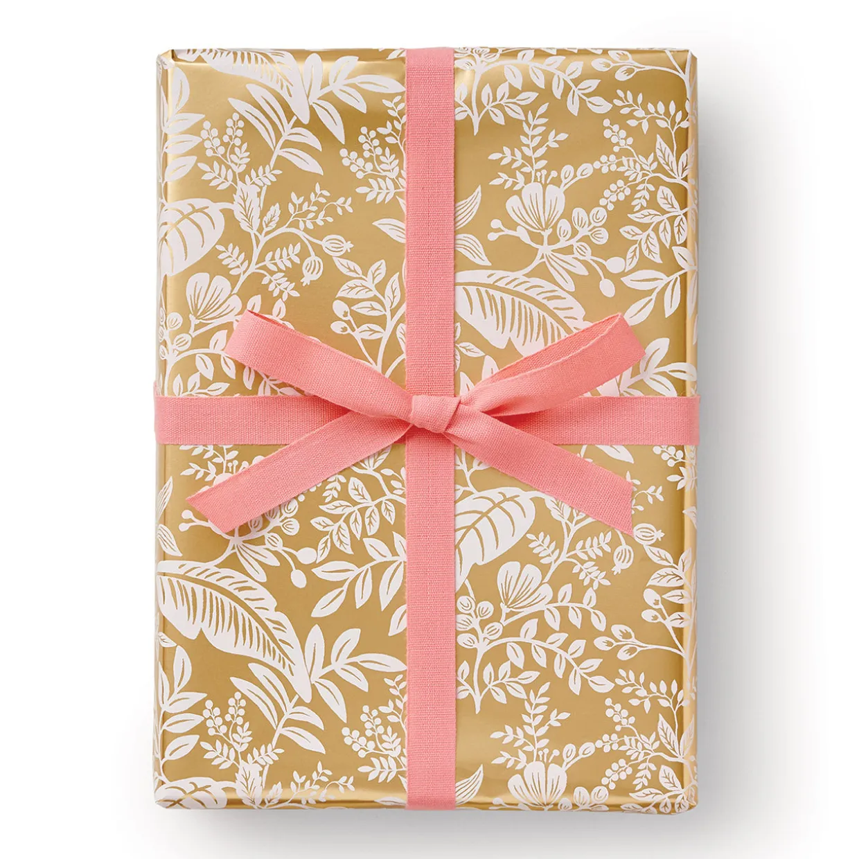 Delight your loved ones with a gift wrapped in Rifle Paper Co.’s shiny Canopy Gold Wrapping Paper.