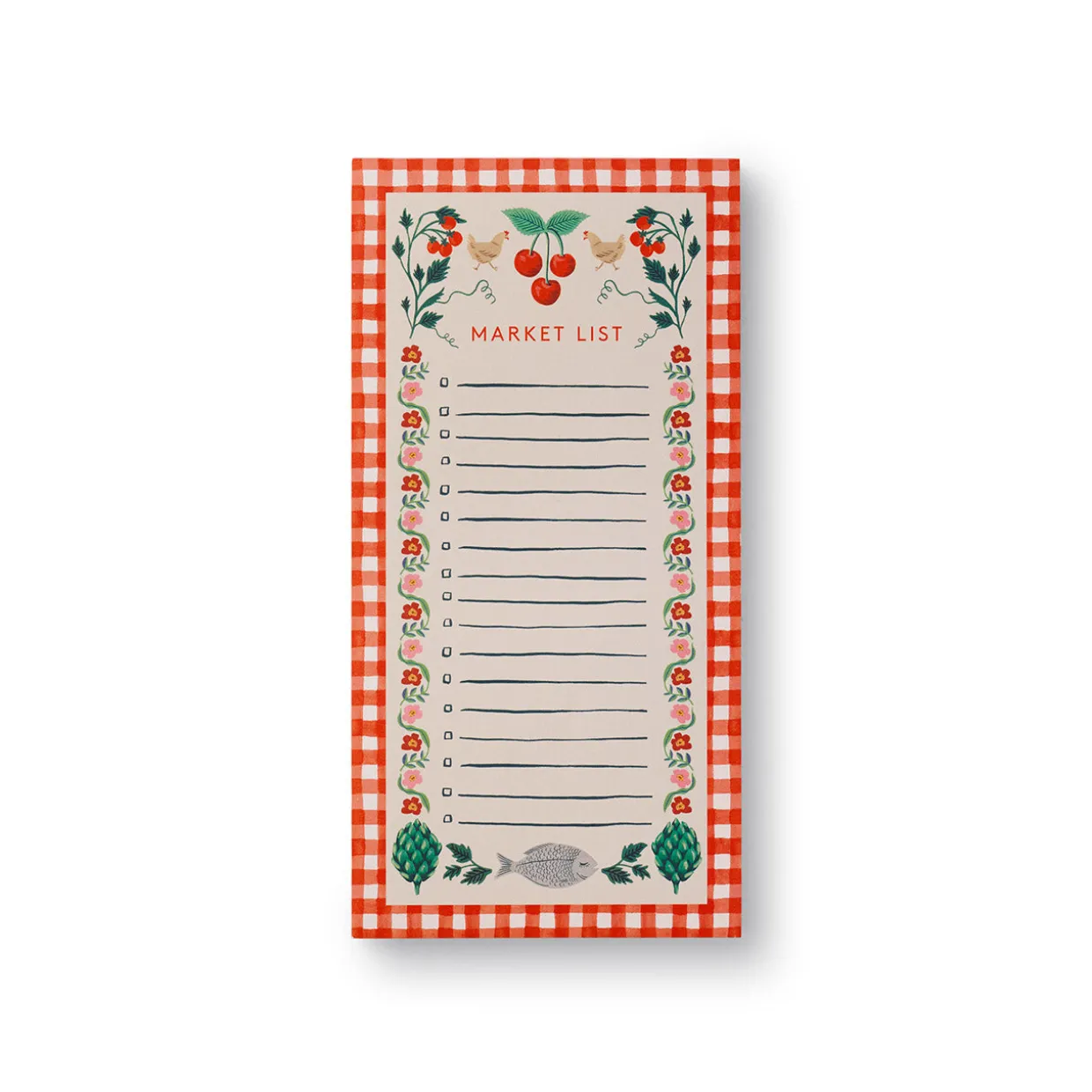 Remind yourself to pick up eggs and milk in timeless style with the vintage-inspired design of Rifle Paper Co.’s Cherry Farm Shopping Pad.