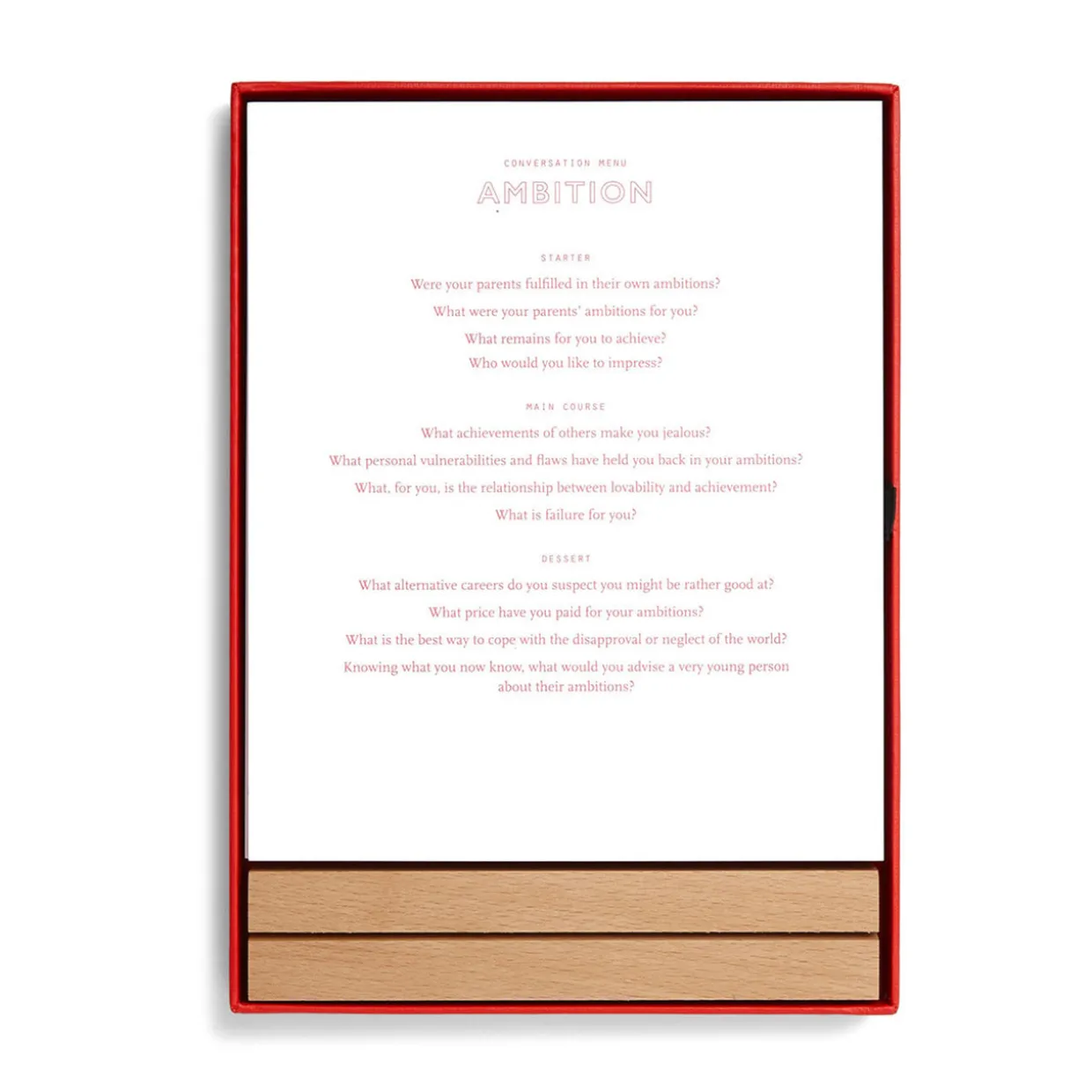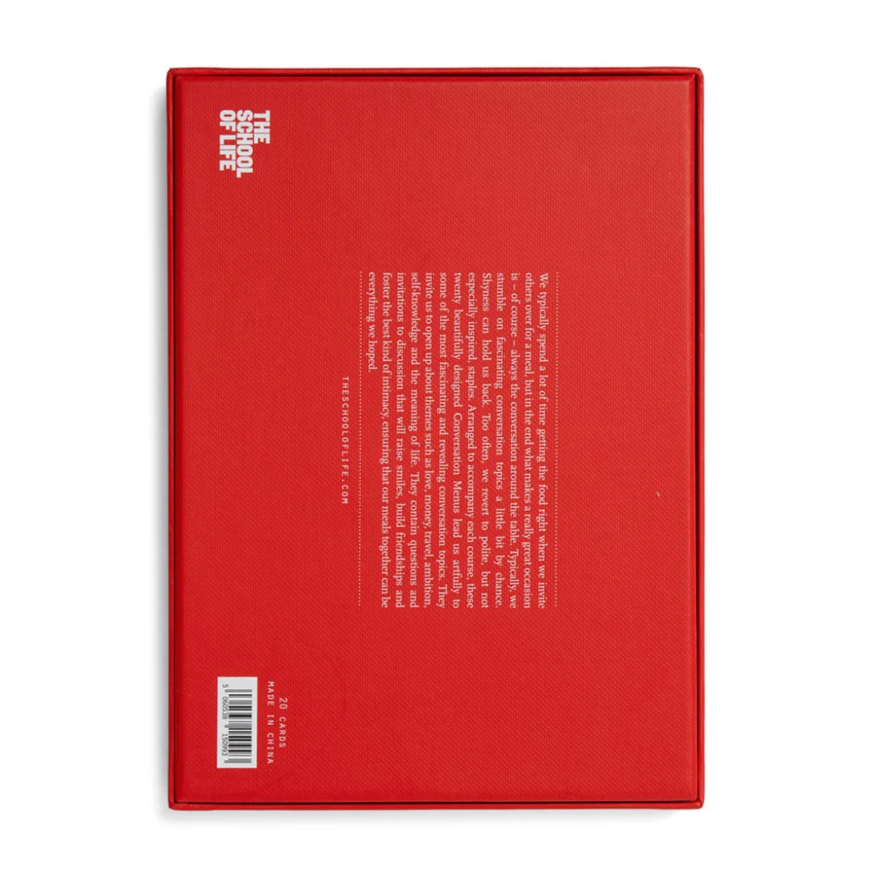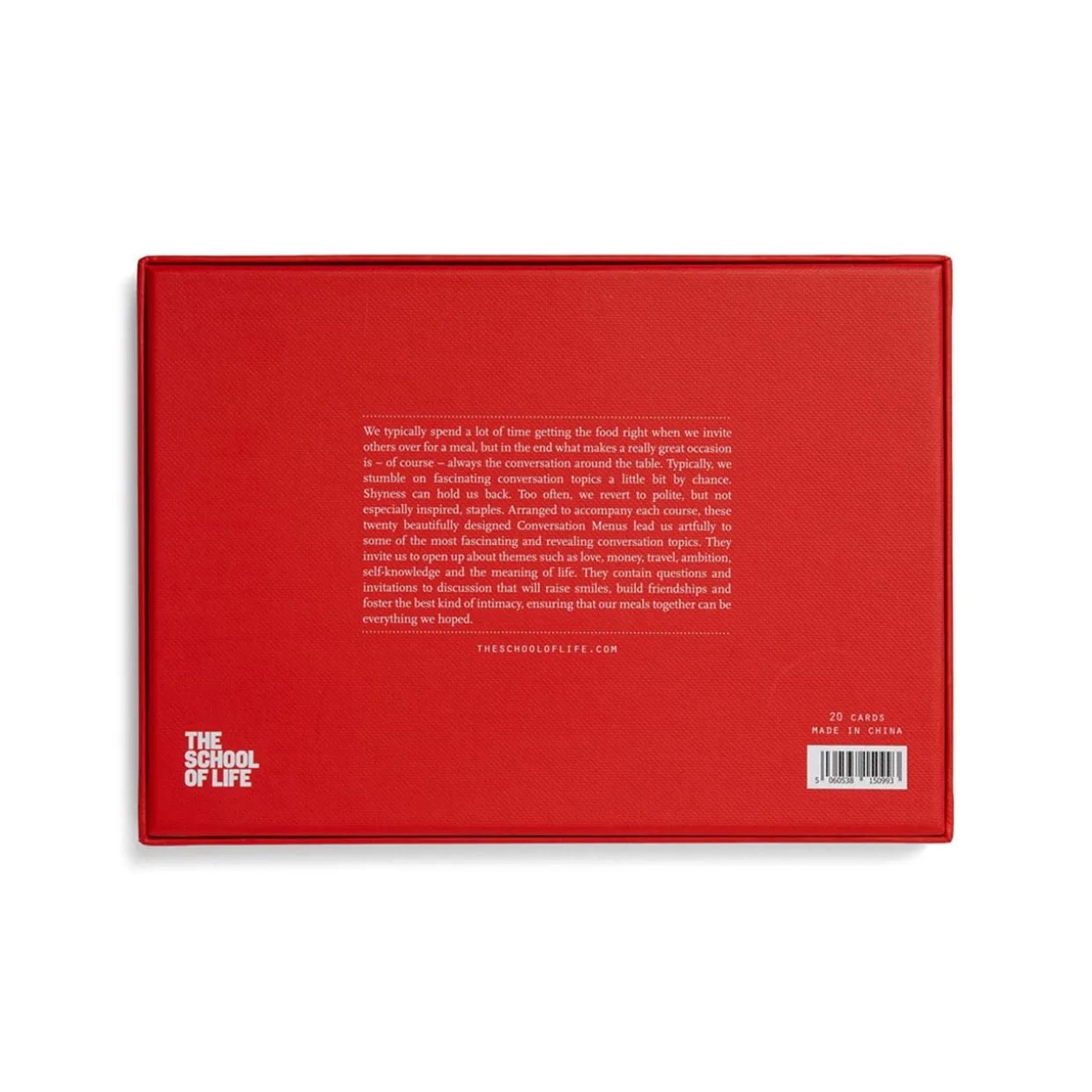 Typically, we stumble on fascinating conversation topics a little bit by chance. Shyness can hold us back. Too often, we fall back on polite but not especially inspired staples. Arranged to accompany each course, these beautifully-designed twenty Conversation Menus lead us artfully to some of the most fascinating and revealing conversation topics. They invite us to open up about themes like love, money, travel, ambition, self-knowledge and the meaning of life. They contain questions that will raise smiles, build friendships and foster the best kind of intimacy, ensuring that our meals together can be everything we hoped. Please note: this product contains adult content.