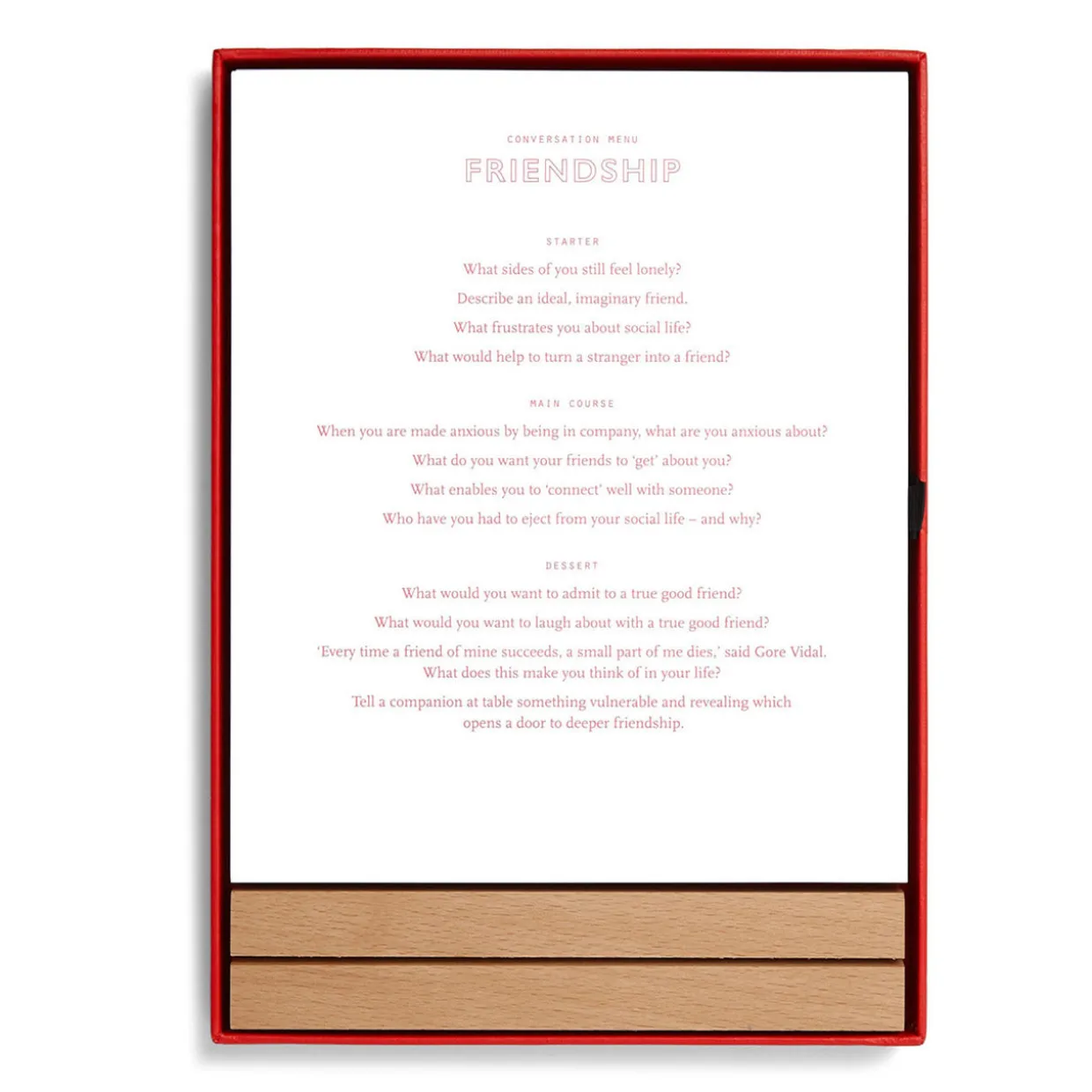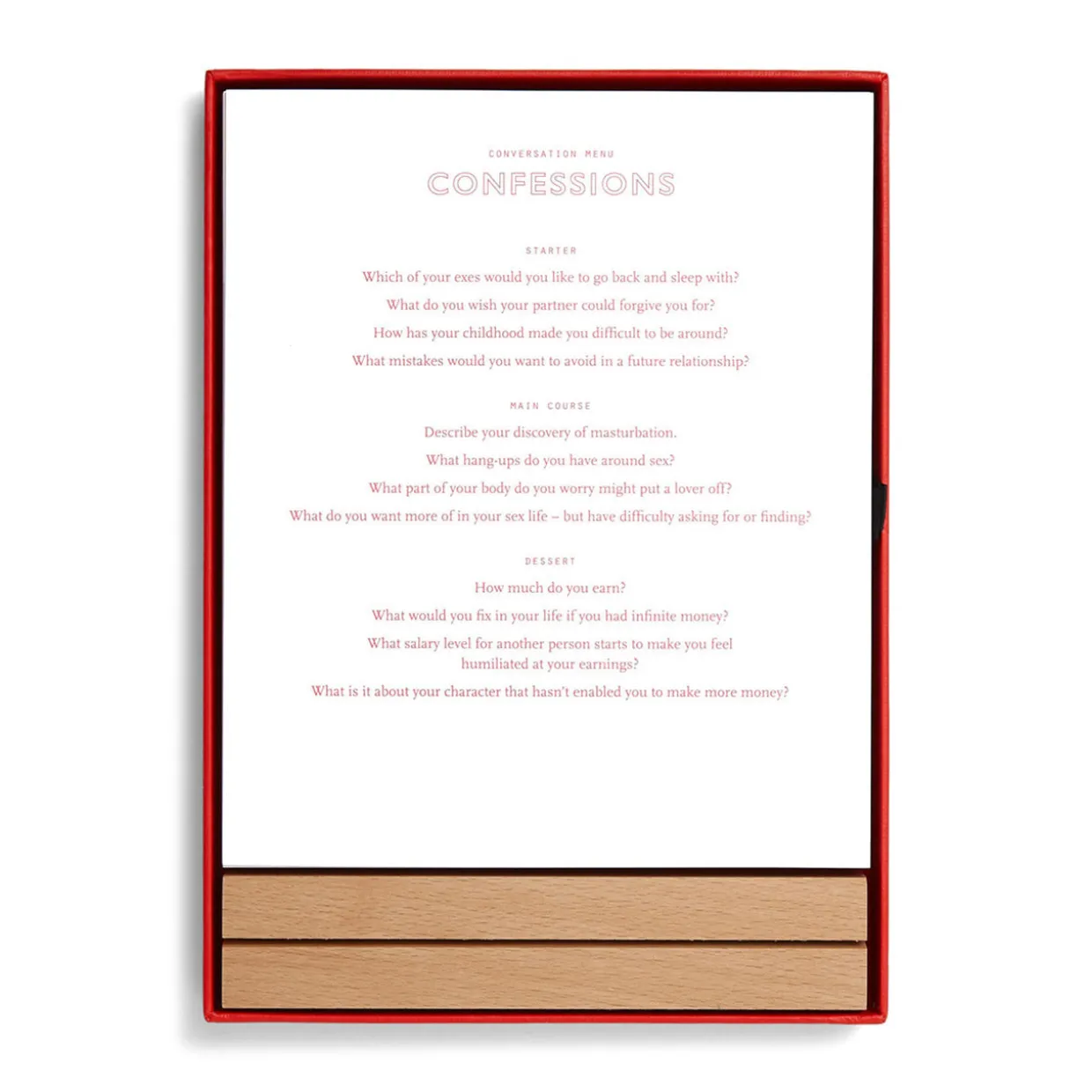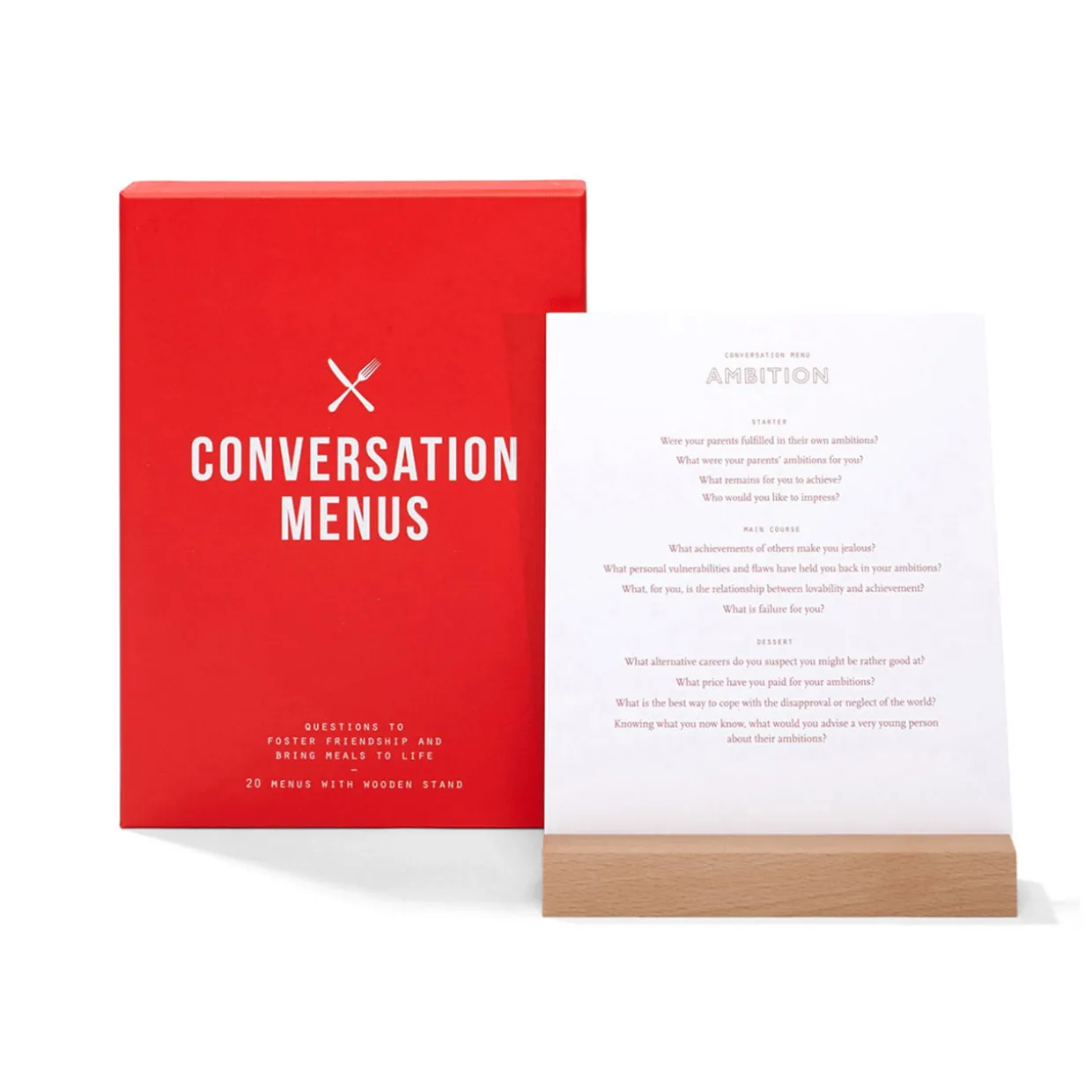 Typically, we stumble on fascinating conversation topics a little bit by chance. Shyness can hold us back. Too often, we fall back on polite but not especially inspired staples. Arranged to accompany each course, these beautifully-designed twenty Conversation Menus lead us artfully to some of the most fascinating and revealing conversation topics. They invite us to open up about themes like love, money, travel, ambition, self-knowledge and the meaning of life. They contain questions that will raise smiles, build friendships and foster the best kind of intimacy, ensuring that our meals together can be everything we hoped. Please note: this product contains adult content.
