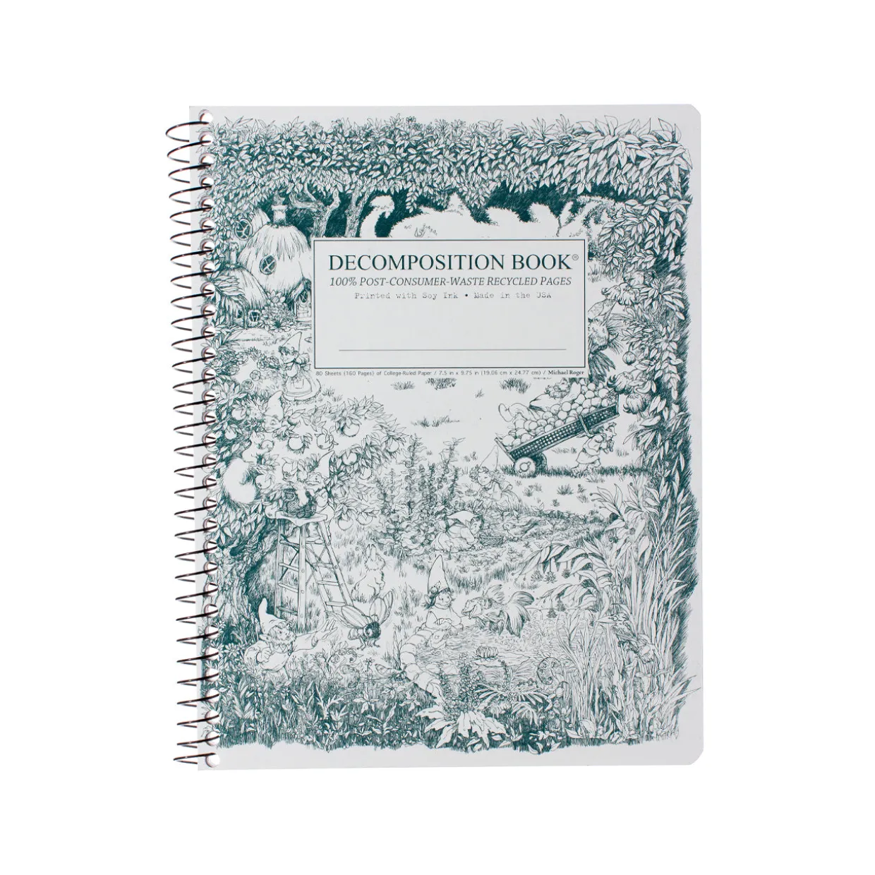 All Decomposition notebooks are made from completely recycled materials. The 160 college-ruled pages (7mm ruled lines using soy ink) of unbleached white paper are made from 100% post-consumer waste in blue with an adjacent margin in red, and are micro-perforated for easier and neat page removal. The covers are heavy card and the energy used in production is bio-gas, with a spiral bind for even easier note-taking! The inside cover features all kinds of witty, useful information and sketches.