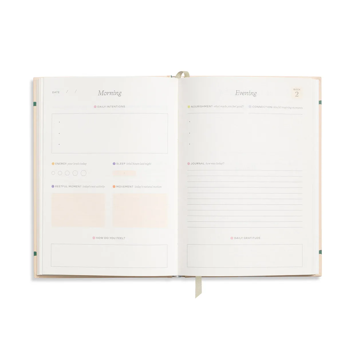 Features an introduction to the wellness eco system and the 6 pillars that sit within it; 12 weeks worth of daily overview pages (two-page spread for each day), with space for logging intentions, sleep and energy levels in the morning and evening; weekly and monthly check ins against the 6 wellness pillars; useful articles throughout, written by wellness expert; reflection and 360 life wheel at the end of your journalling journey