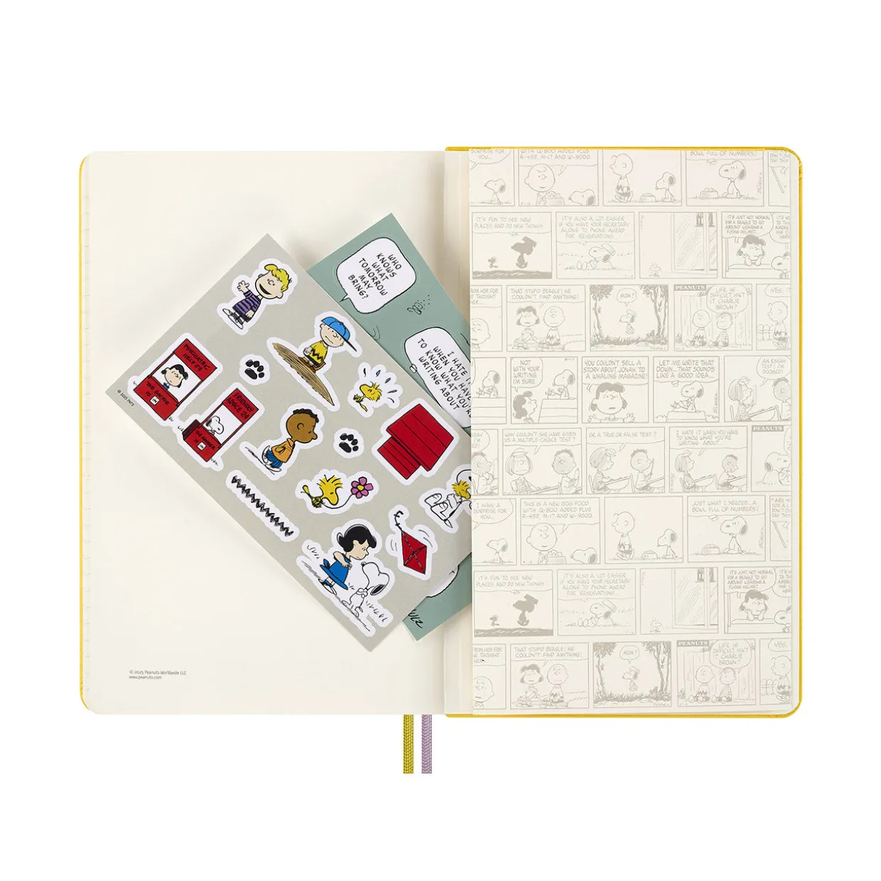 Features Peanuts stickers and bookmark, customised endpapers and back pocket, rounded corners, elastic closure and 2 matching ribbon bookmarks, ivory-colored 100gsm acid-free paper, ‘In case of loss’ printed on the flyleaf, expandable inner pocket in the back