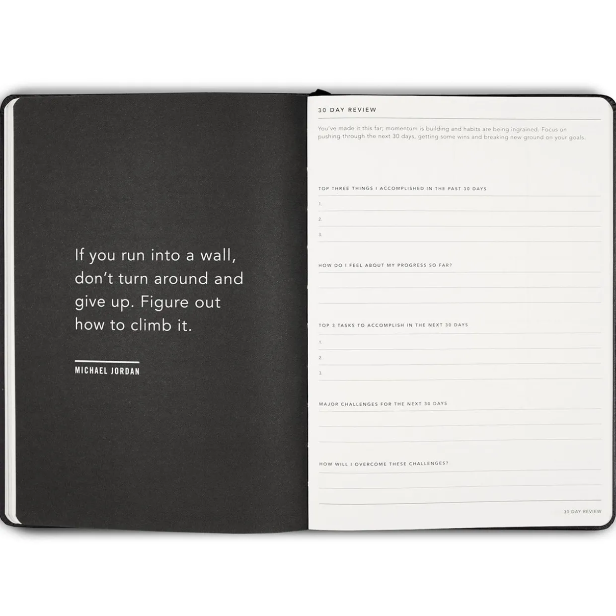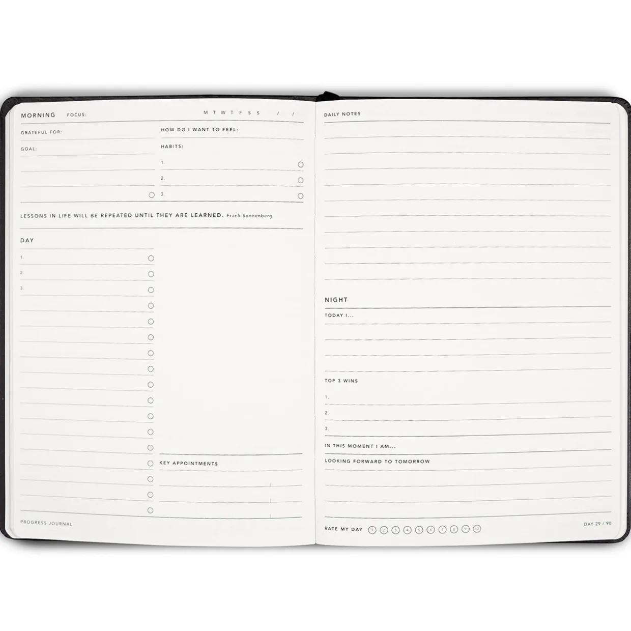 Features daily to-do list to keep track of tasks; nightly reflection prompts to stay motivated; monthly reviews to track your progress; numbered pages; ‘How to’ double page spread; debossed artwork on front cover; 2 x divider ribbons