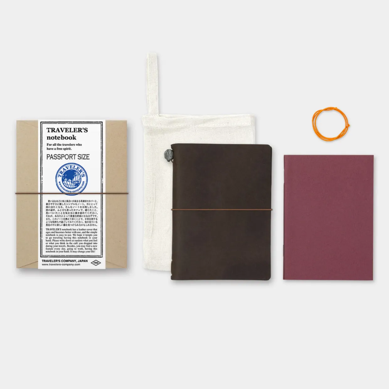 Includes a leather cover, 1 x plain refill, 1 x cotton carry/storage bag, 1 x spare elastic tie