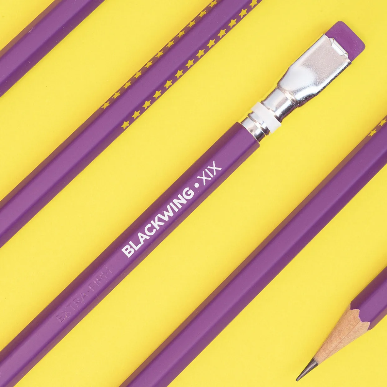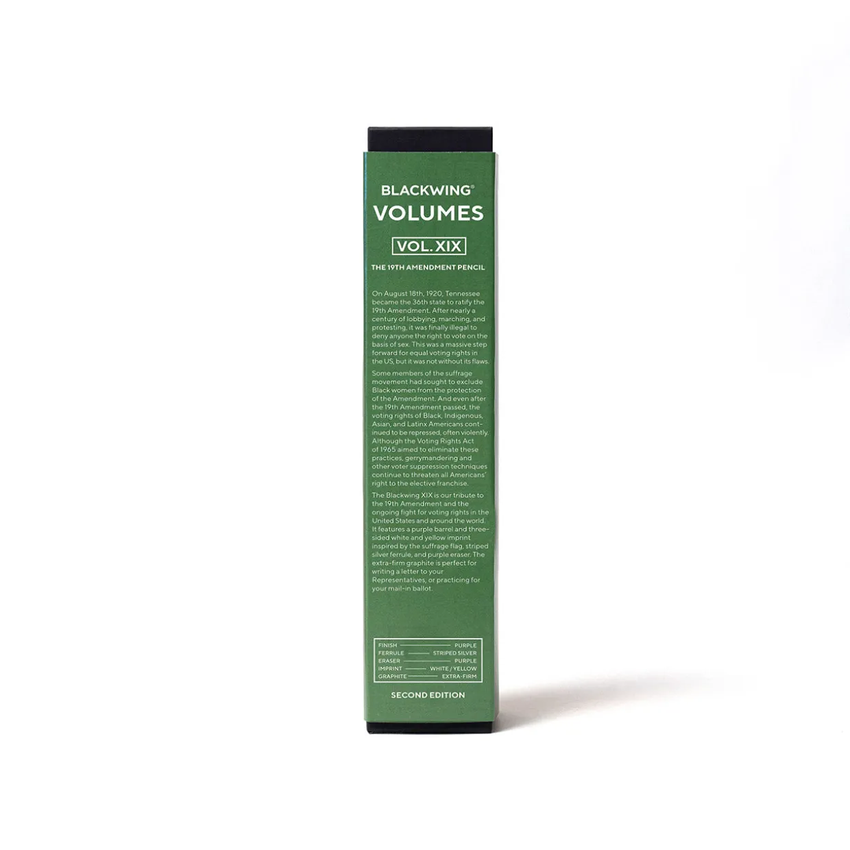 The Blackwing XIX is our tribute to the 19th Amendment and the ongoing fight for voting rights in the United States and around the world. Each pencil features a purple barrel and three-sided white and golden-yellow imprint inspired by the suffrage flag, striped silver ferrule, and purple eraser. The 36 yellow stars represent the 36 states that ratified the amendment.